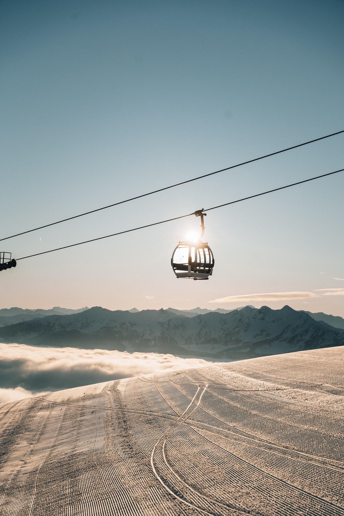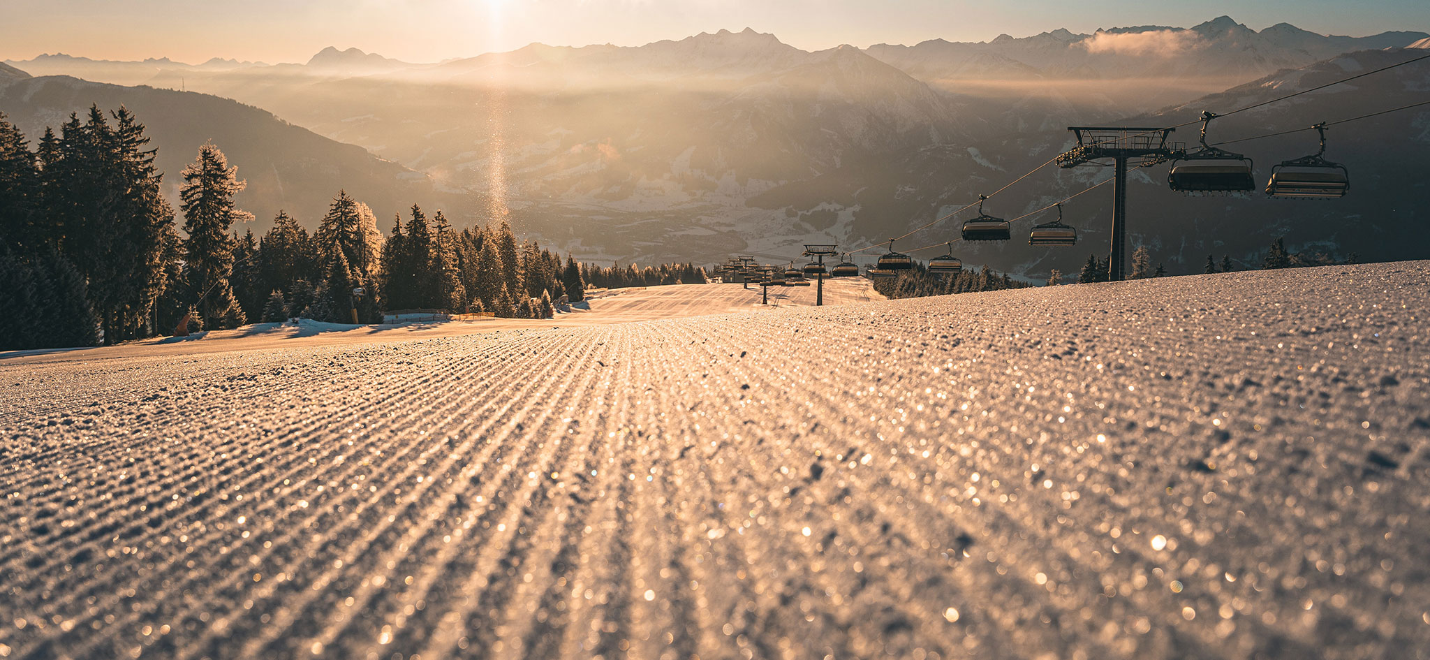 Genießen Sie den herrlichen Sonnenaufgang und den wunderbaren Blick auf die umliegenden Berge mitten im Skigebiet.