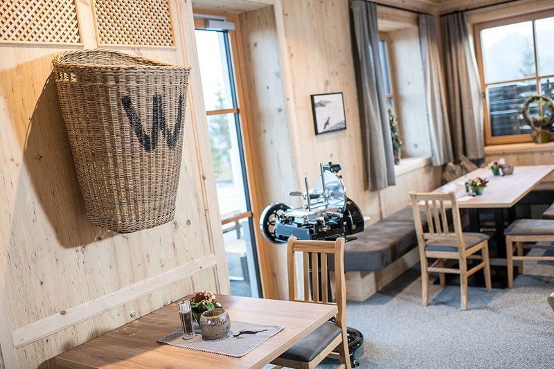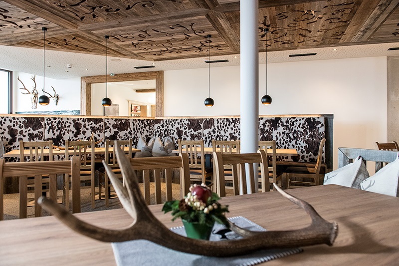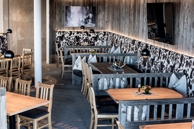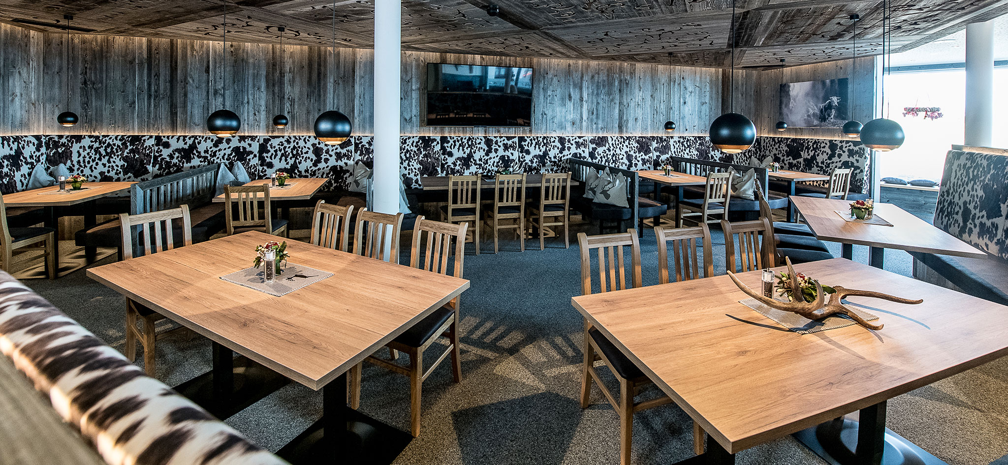 Im Inneren der Glockneralm angekommen befindet sich die offene „Kuhlimuh-Stube“. Die mit Kuhoptik tapezierten Bänke und das angenehme Licht bieten eine Almatmosphäre zum Wohlfühlen.