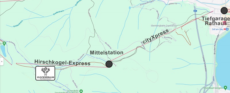 Sie fahren mit dem cityXpress bis zur Mittelstation, steigen dort um in den Hirschkogel-Express ein und fahren dann direkt mit den Skiern bis zur Glockneralm.