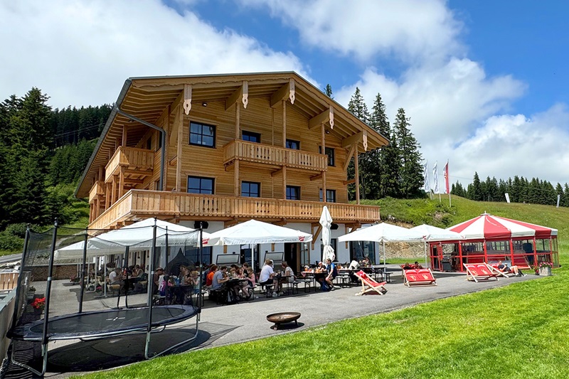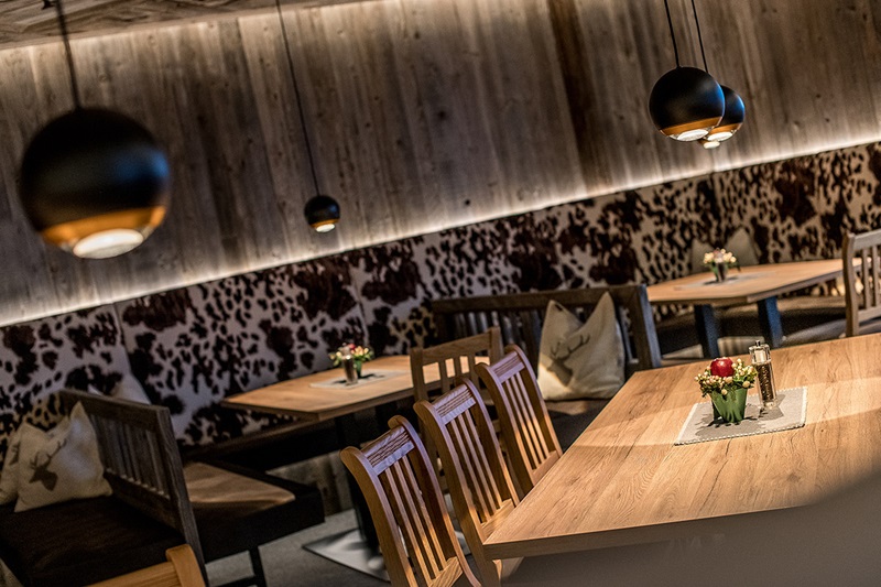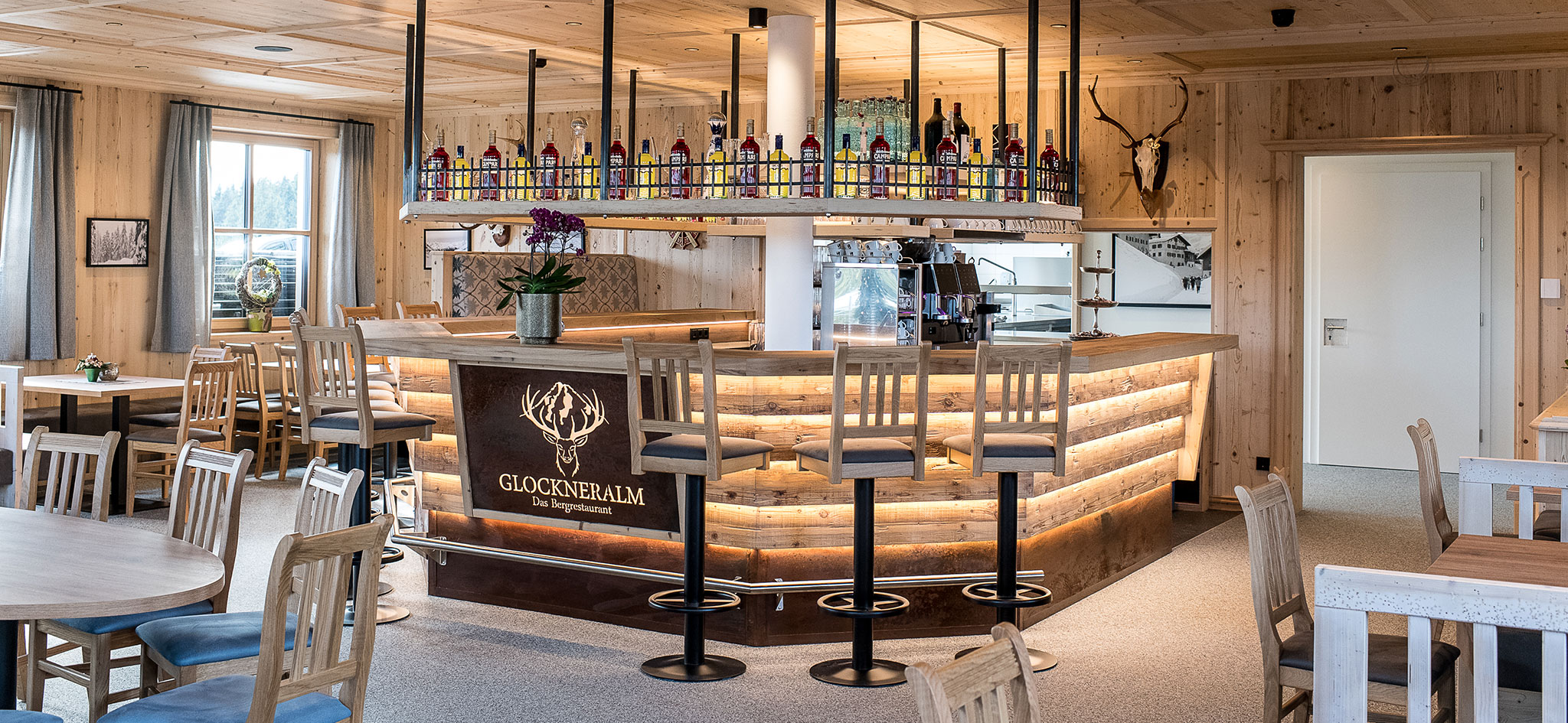 Im Inneren der Glockneralm angekommen befindet sich die offene „Kuhlimuh-Stube“. Die mit Kuhoptik tapezierten Bänke und das angenehme Licht bieten eine Almatmosphäre zum Wohlfühlen.